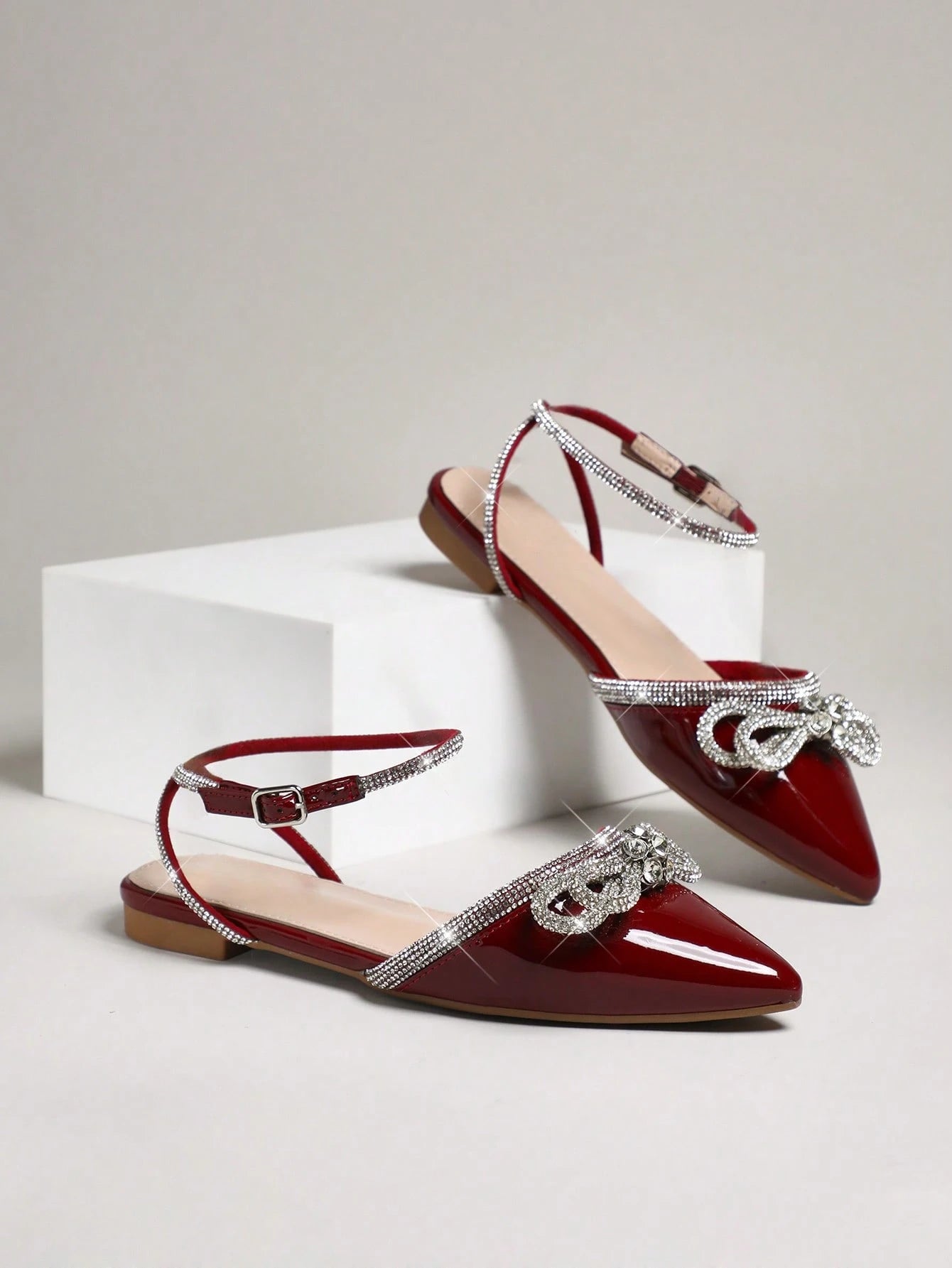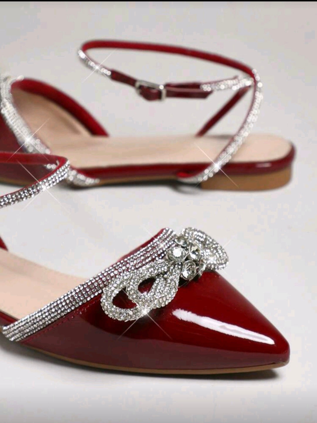 SHUZIA Bailarinas cómodas con puntera en punta, tira de tobillo y lazo con strass para mujeres
