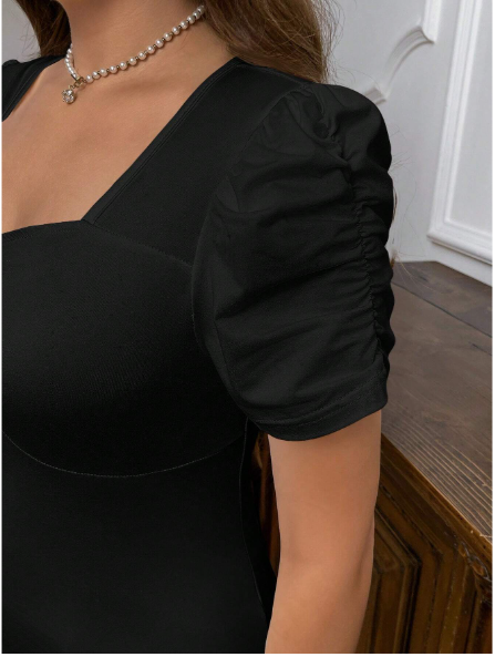 SHEIN Privé Camiseta blanca ajustada con cuello de ojo de cerradura plisado, manga abullonada y cordón ajustable para mujer talla grande