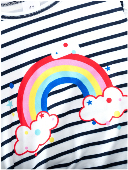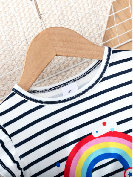 2 Piezas Conjunto de Top de manga corta con cuello redondo de rayas y estampado arcoíris y Falda abotonada de línea A de unicolor, apropiado para uso diario, primavera/verano, estilo casual juvenil