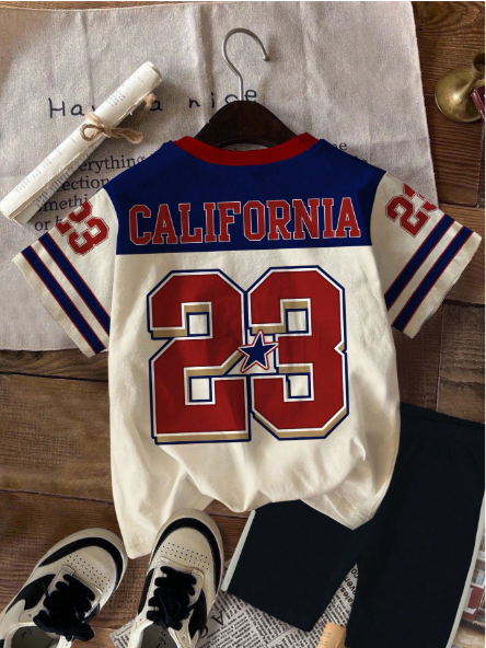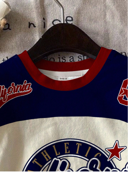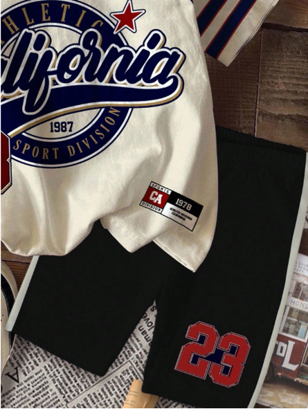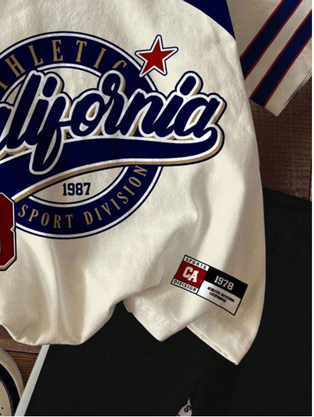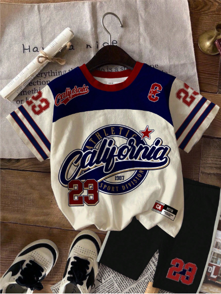 SHEIN Set de 2 piezas de pantalones cortos informales y camiseta de manga corta con estampado de letras y números vintage para niña preadolescente, adecuado para verano, moda de los 80, estilo atlético, preparado para graduación, con lazo dulce