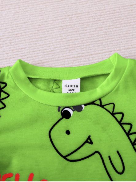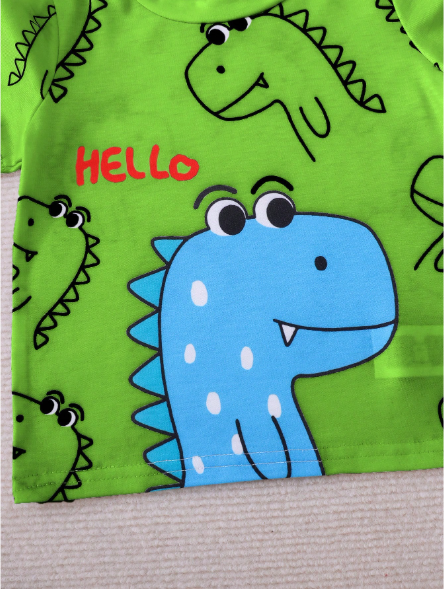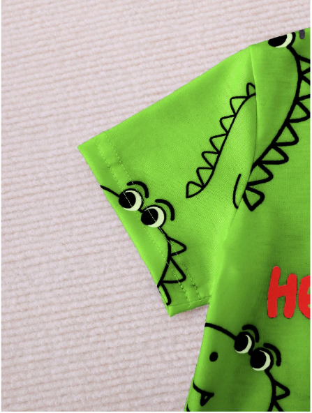 SHEIN Playful Pals Conjunto casual de primavera y verano para niño pequeño - Camiseta de manga corta y cuello redondo estampada con "HOLA Dinosaurio" en colores, combinada con pantalones cortos vaqueros clásicos, mostrando un estilo adorable y de moda. Confeccionado con tejidos suaves para un ajuste cómodo, el diseño de dinosaurio es divertido y vibrante, aportando una energía infinita al look diario de su pequeño caballero. Un conjunto completo para lograr el atuendo de primavera de su bebé