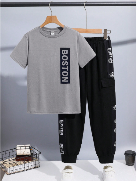 SHEIN Set de 2 piezas para niño preadolescente compuesto por camiseta de cuello redondo de manga corta con gráfico de letras de unicolor y shorts de cintura elástica con franja lateral y bolsillo, adecuado para primavera, verano y otoño, excelente para juegos al aire libre, escuela, calle, fiesta y ocio en casa, alta relación calidad-precio