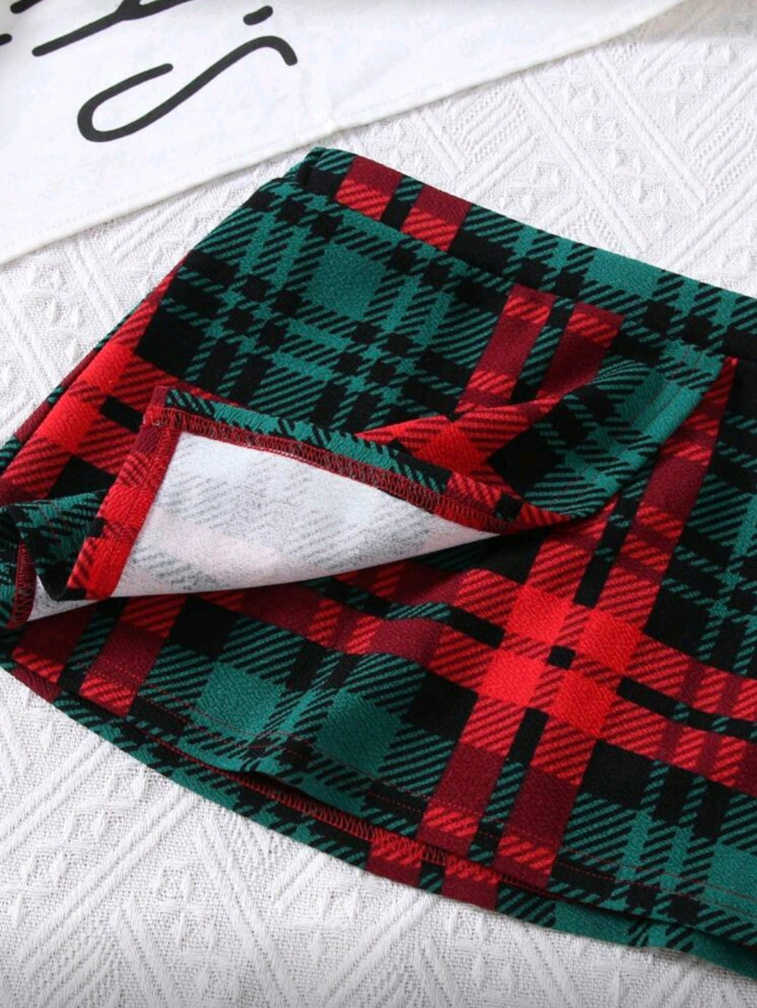 SHEIN Set de 2 piezas para bebé niña: Top de manga larga rojo hecho de punto elástico y falda a cuadros verdes con diadema, conjunto de moda para usar al aire libre en otoño/invierno
