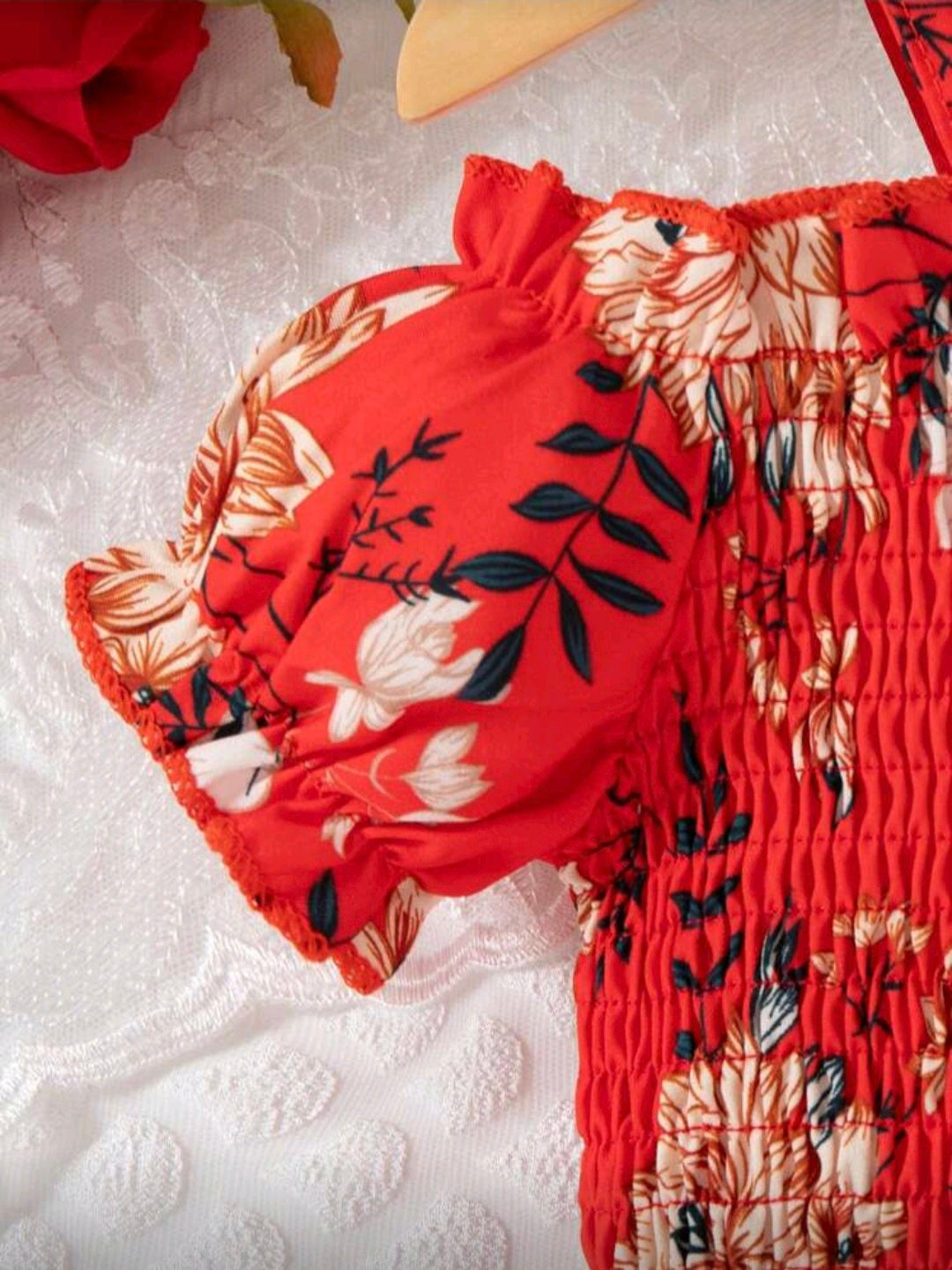 Conjunto de top corto de hombros descubiertos y pantalones cortos a juego con estampado floral rojo, estilo elegante de vacaciones para bebés niñas, verano