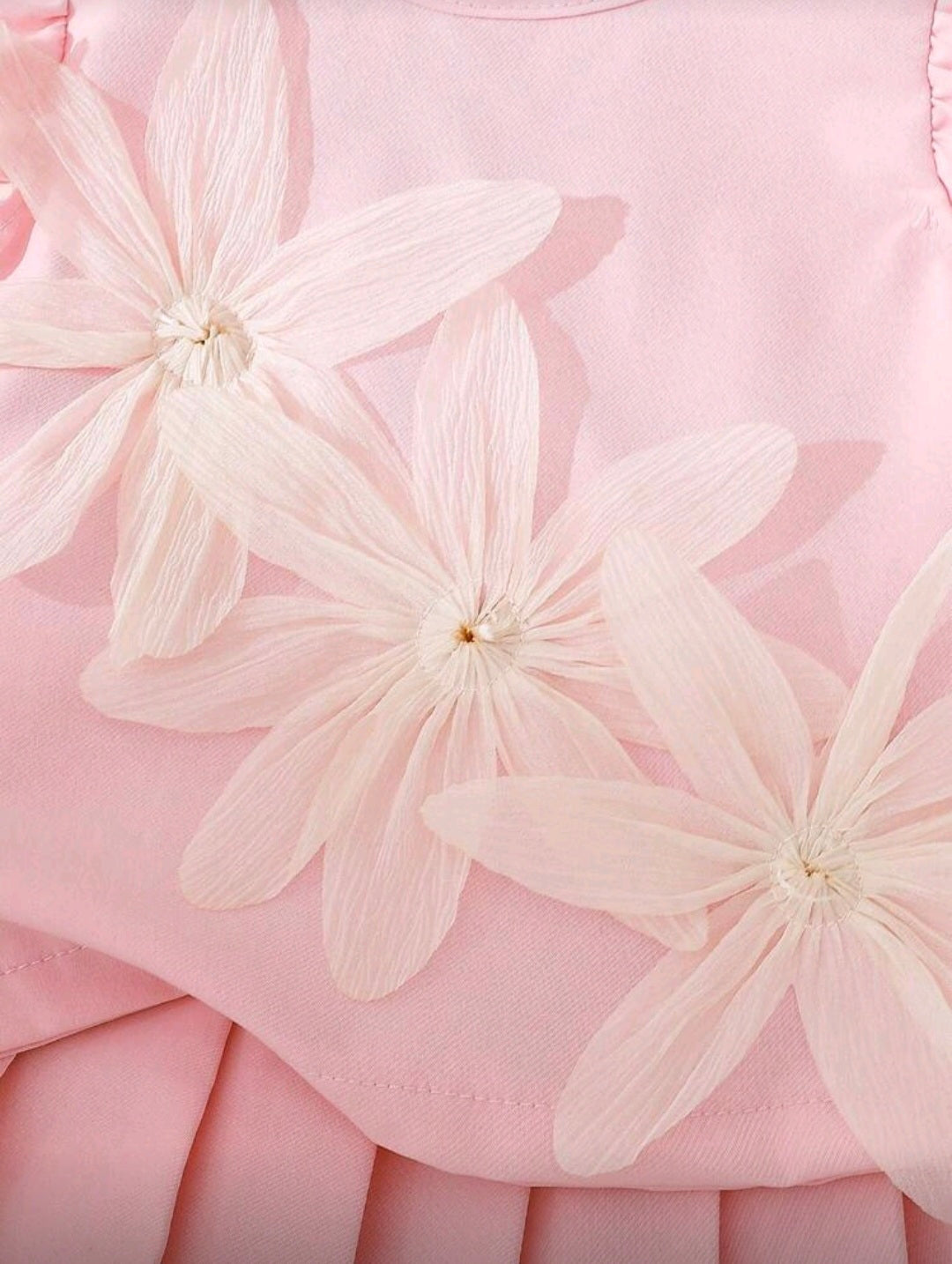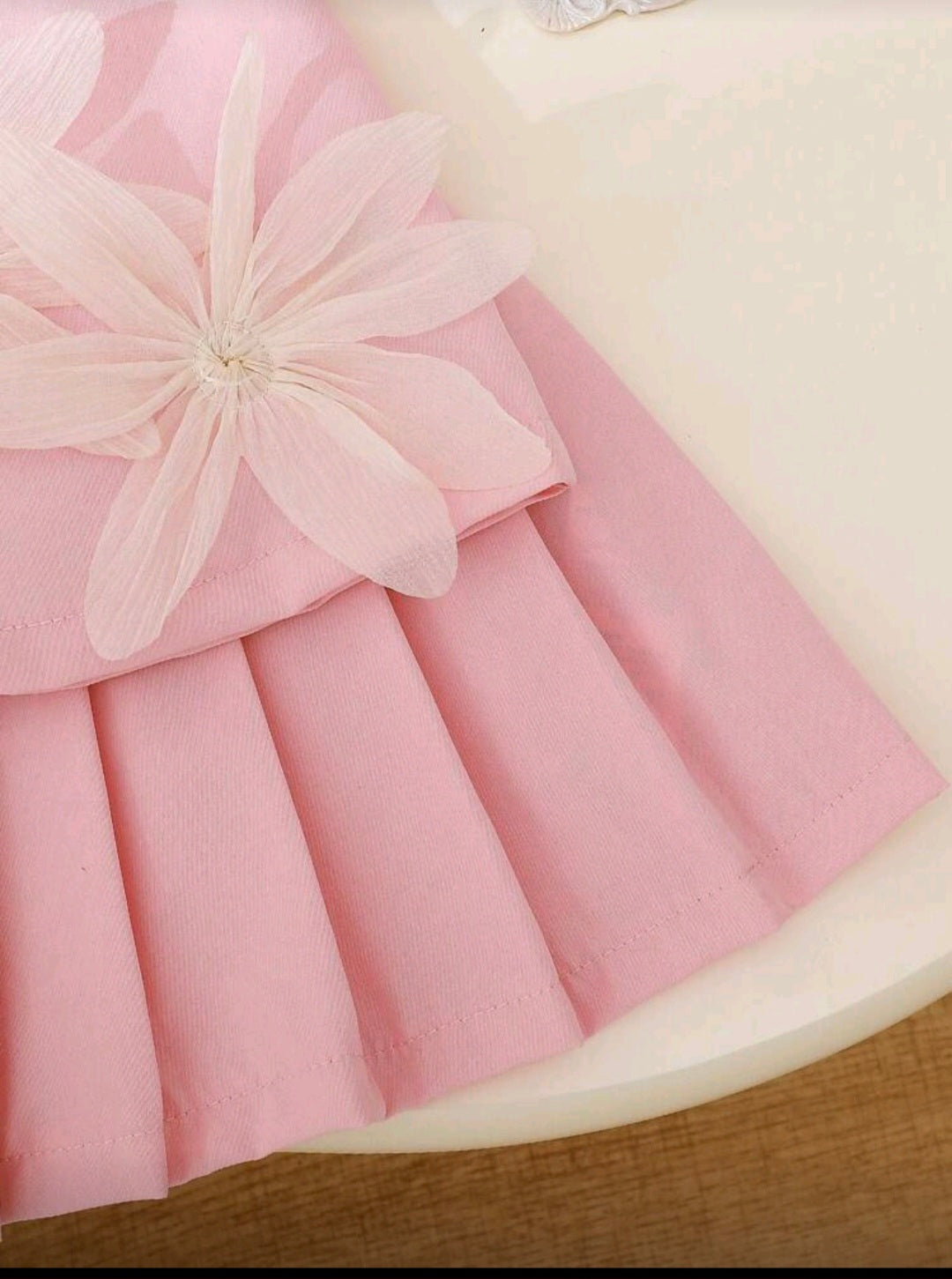 2 piezas Conjunto de moda dulce para el verano con blusa sin mangas con borde floral + falda plisada de color liso para niña bebé