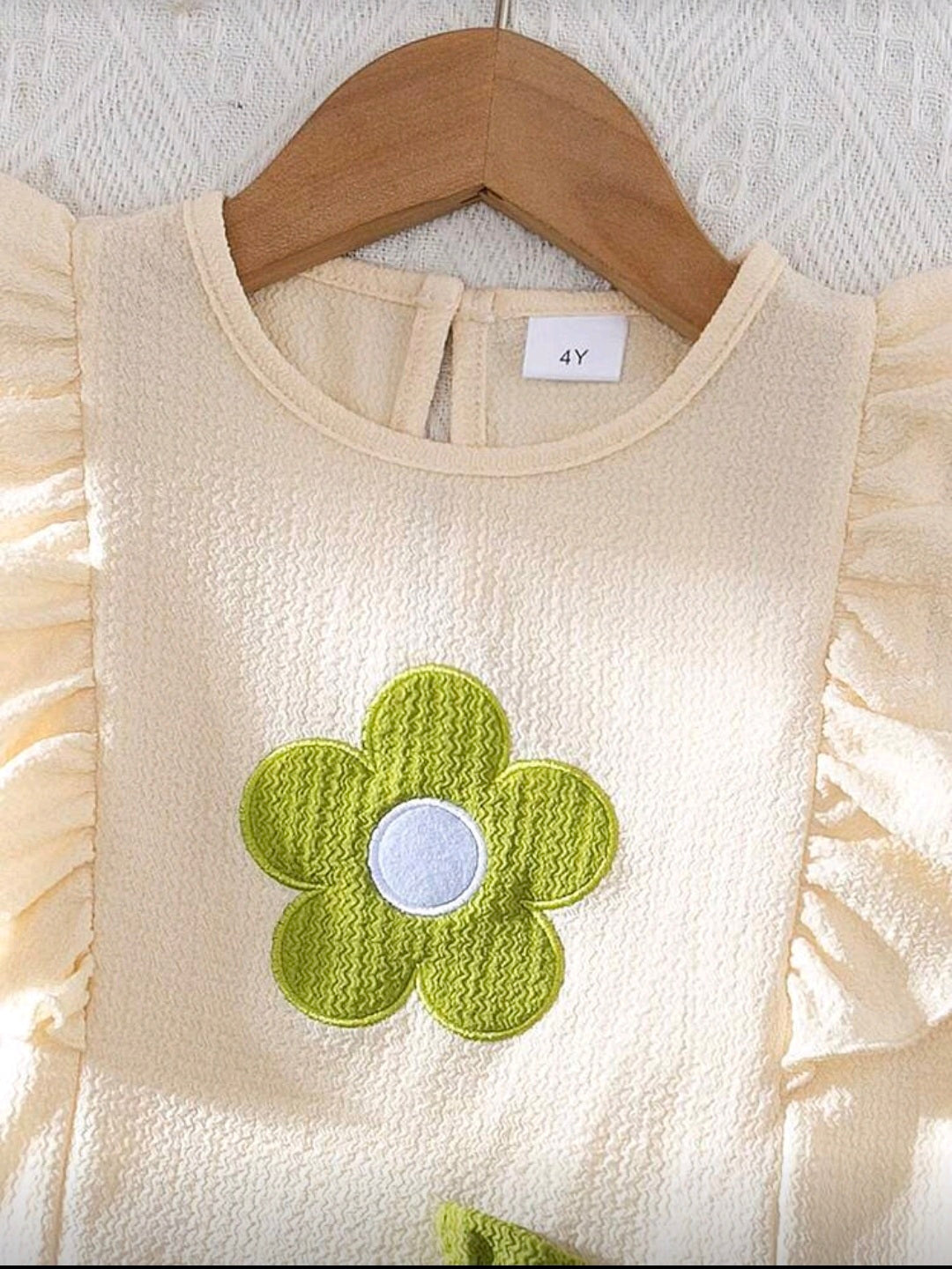 Conjunto de 2 piezas para niña joven de verano con blusa de manga corta con cuello abotonado y bordado floral, y shorts con cintura elástica y bajo con volantes