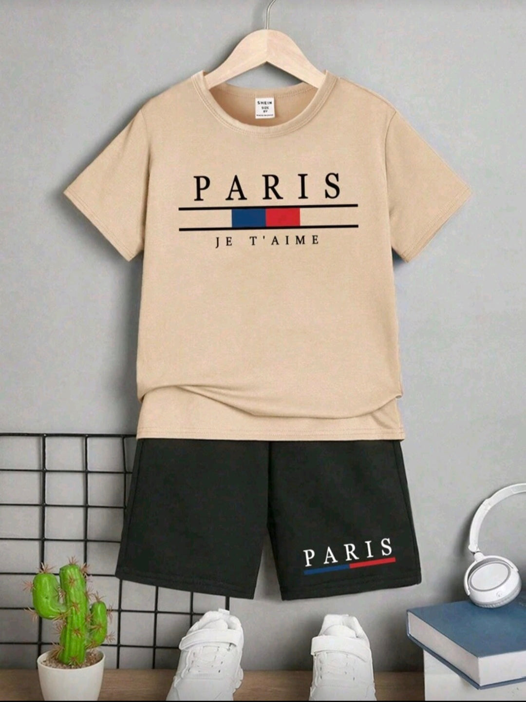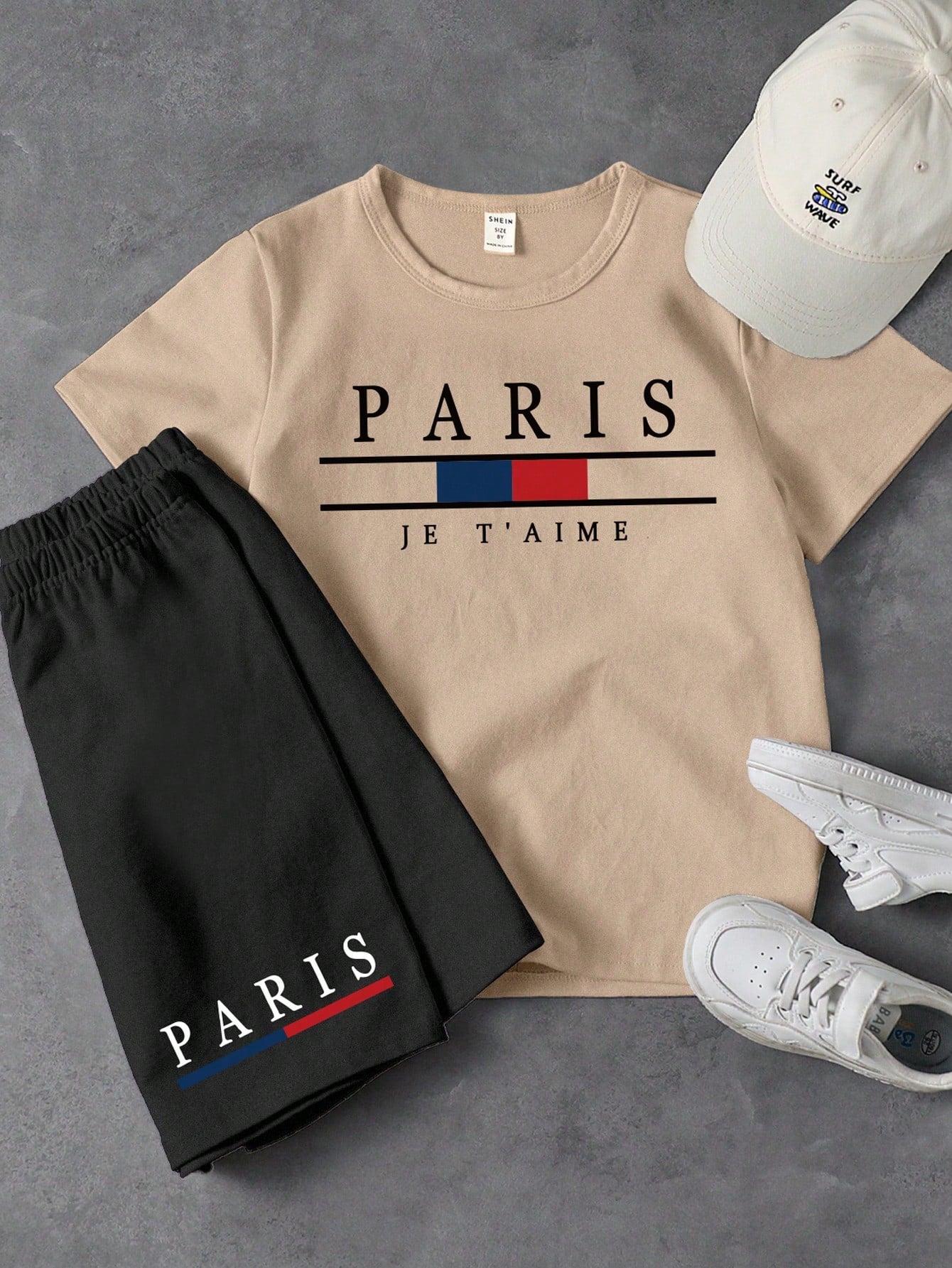 Conjunto casual de verano para niño preadolescente con camiseta de manga corta con cuello redondo y letras impresa y pantalones cortos