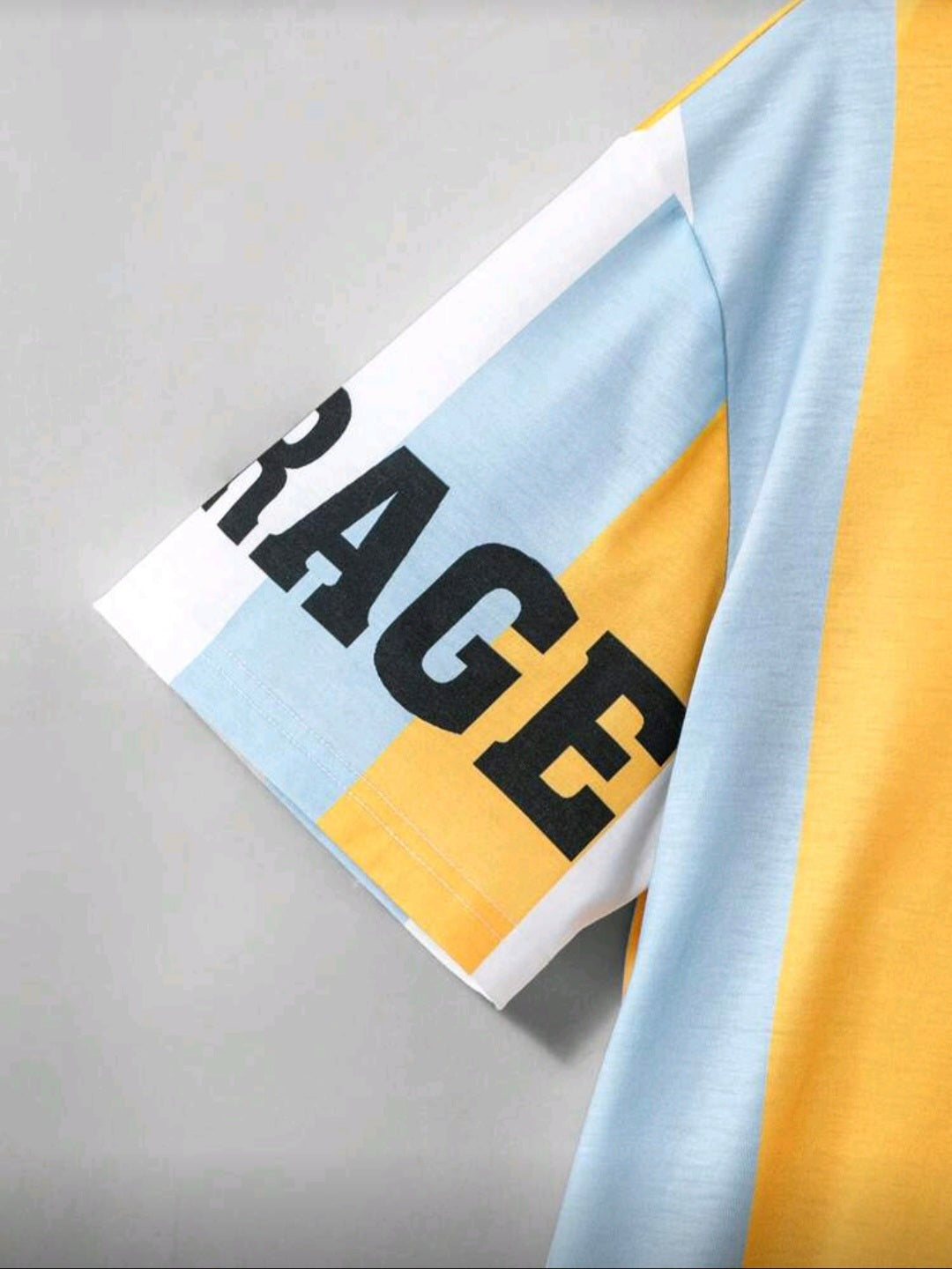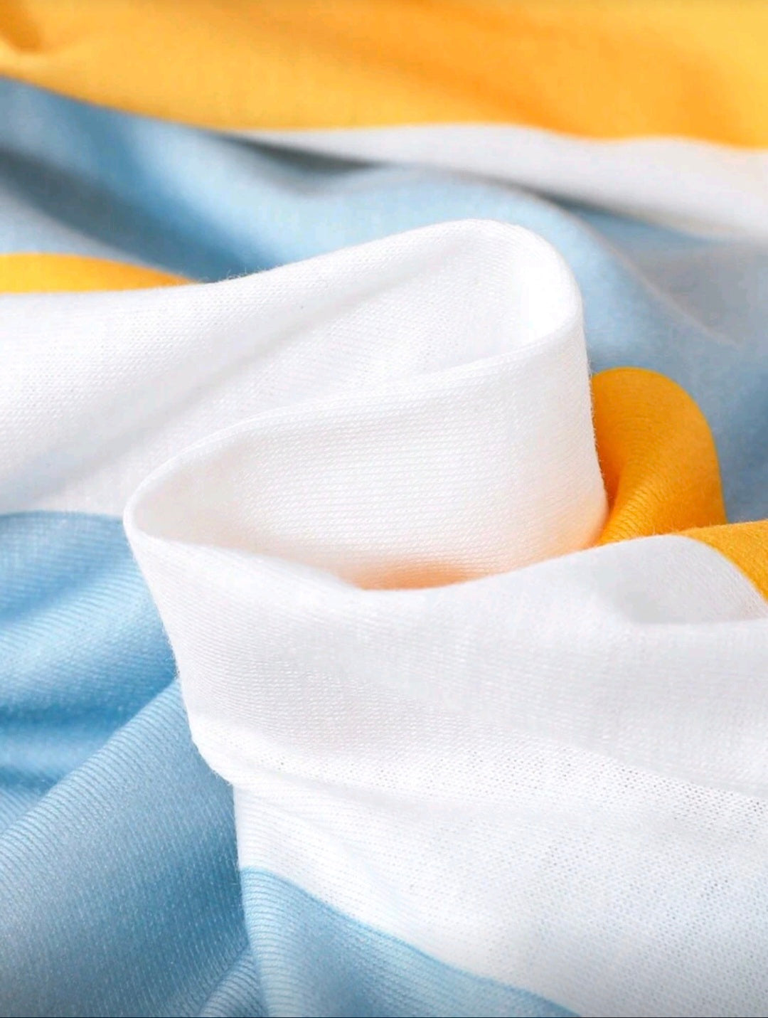 SHEIN Conjunto de 2 piezas para adolescentes, camiseta de polo de hombro caído de rayas anchas y patrón gráfico con cuello de solapa y pantalones cortos blancos con detalle de ribete en azul marino, adecuado para uso diario, escuela, viajes y deportes de primavera y verano