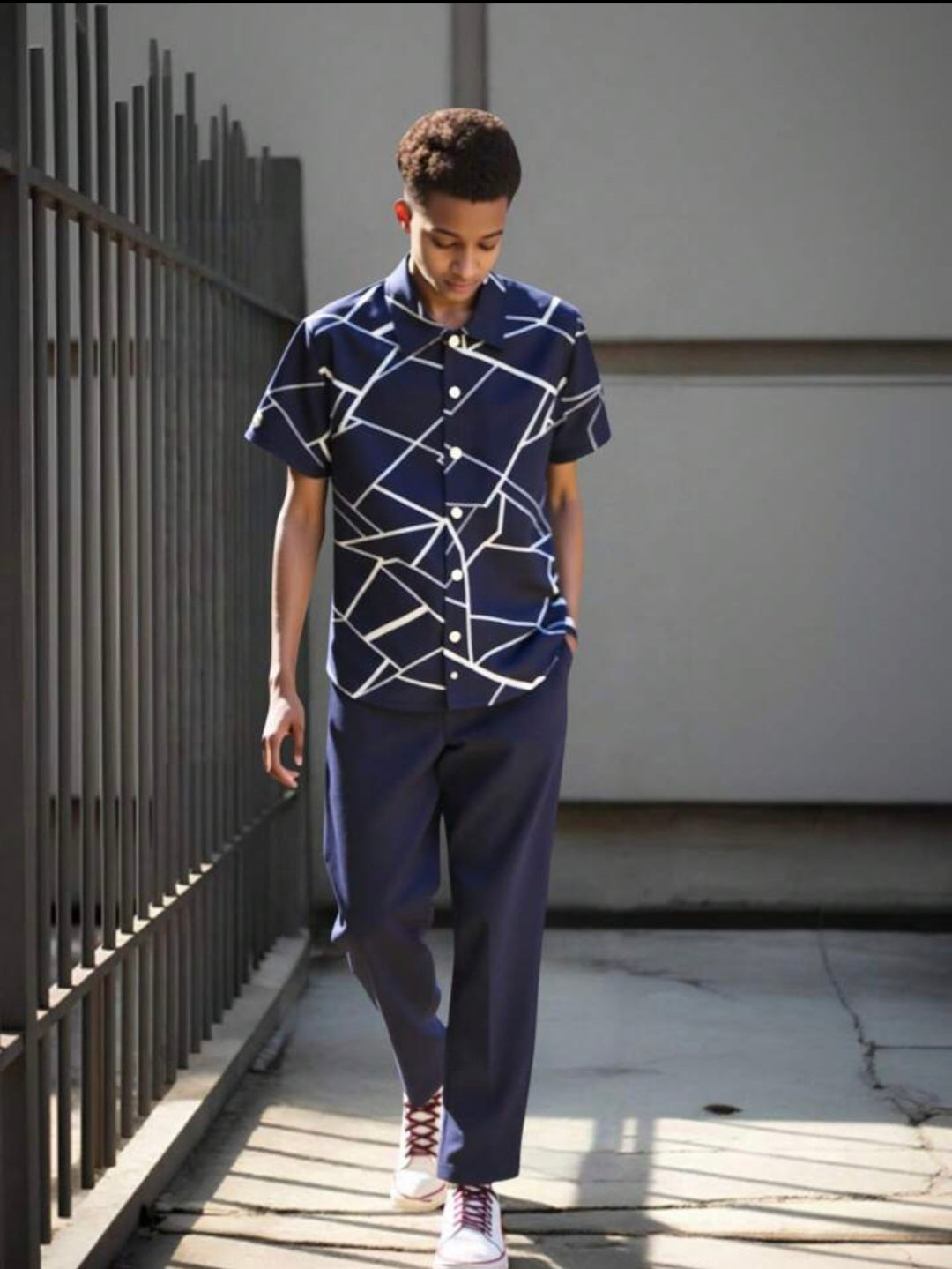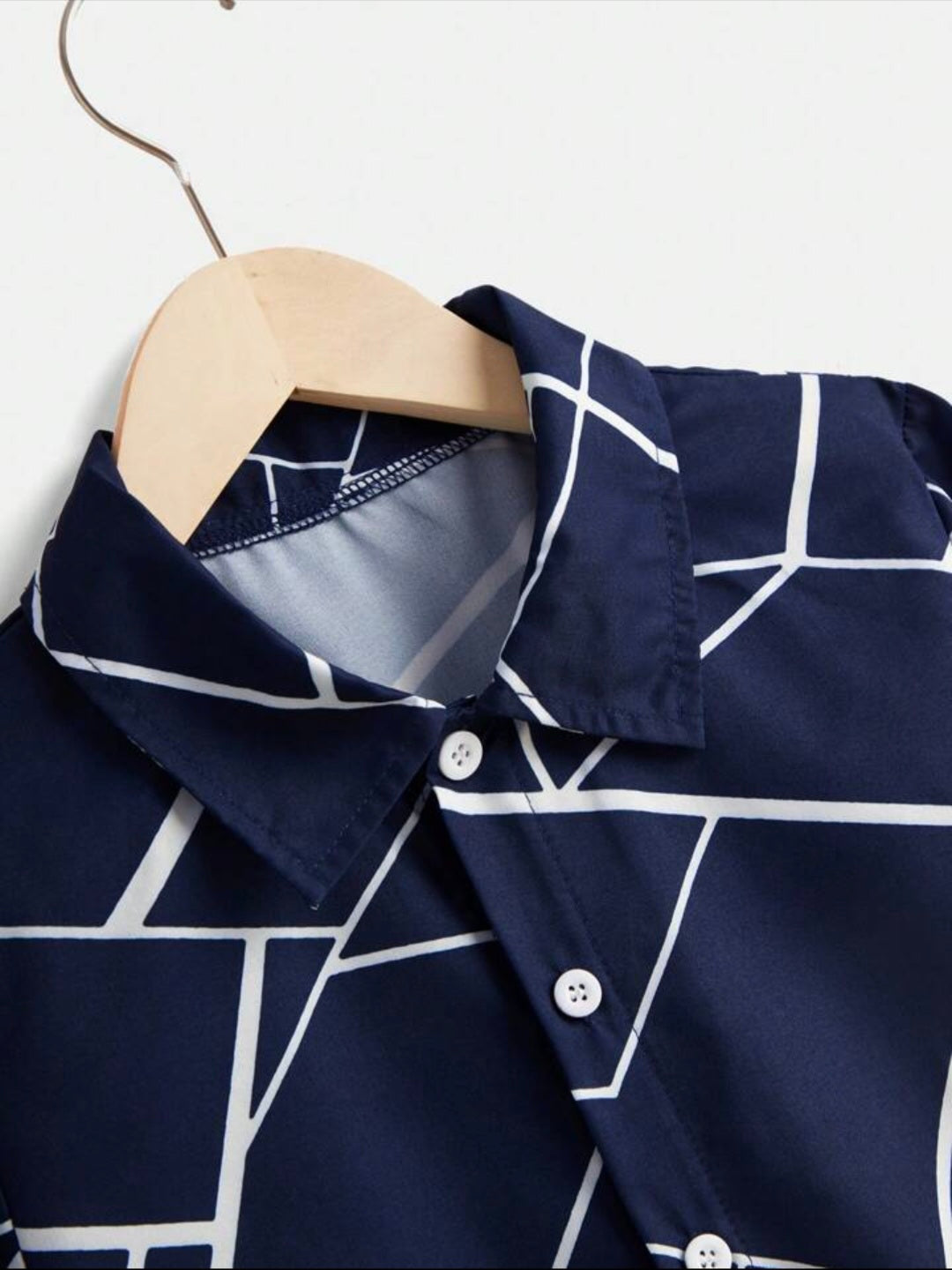 SHEIN Set de 2 piezas de camisa de manga corta con estampado de línea geométrica y pantalones para niños, informal y para uso diario