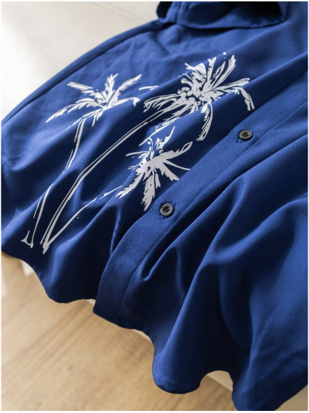 2 paquetes de conjunto informal de niño preadolescente de camisa y pantalones cortos en azul royal con estampado de árbol de coco, adecuado para looks diarios, vuelta al cole, fiestas, ceremonias, bodas, bautizos, y apto para primavera y verano.