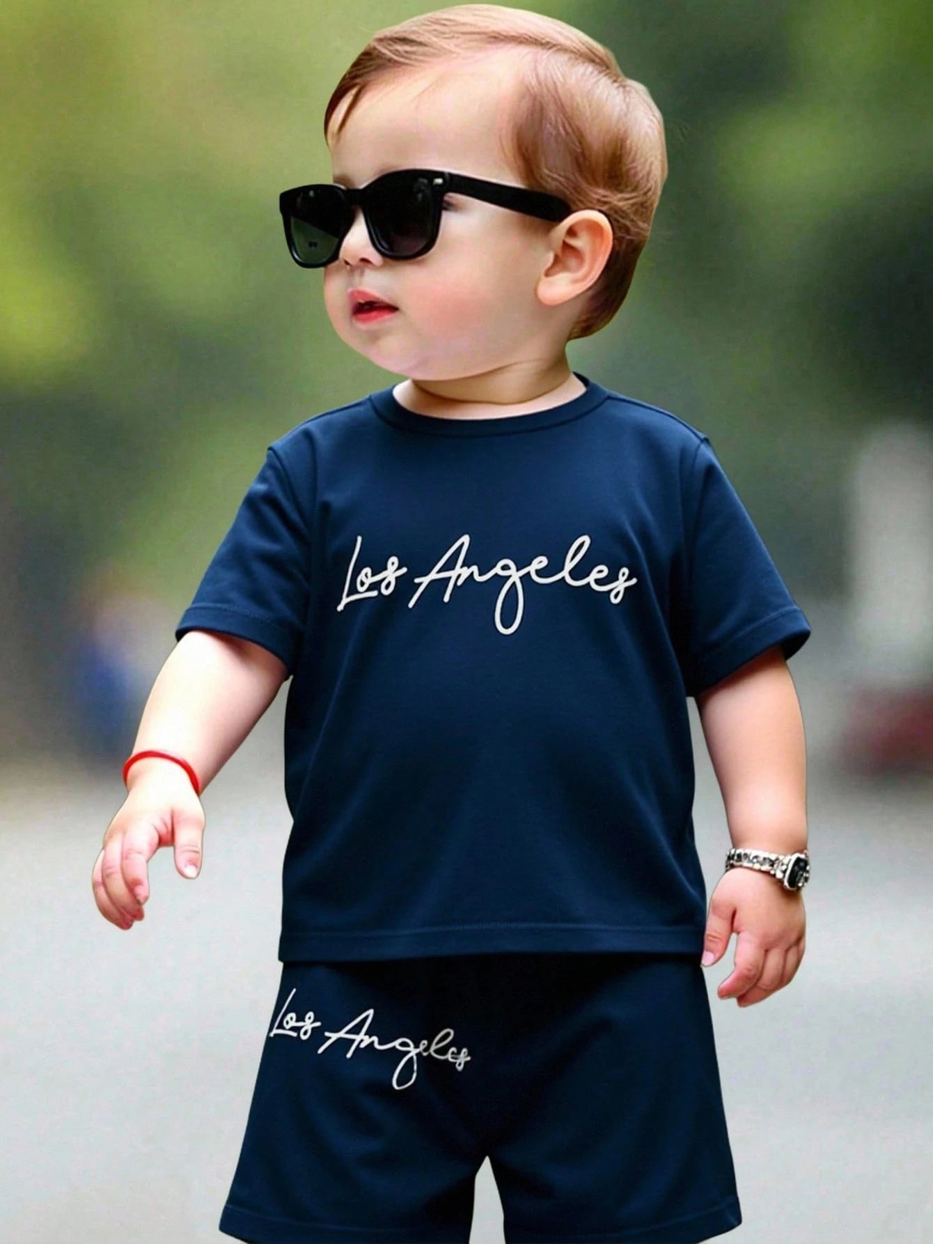 SHEIN 2 piezas Conjunto de camiseta de manga corta con estampado de lema creativo y pantalones cortos de moda casual para niños pequeños, azul