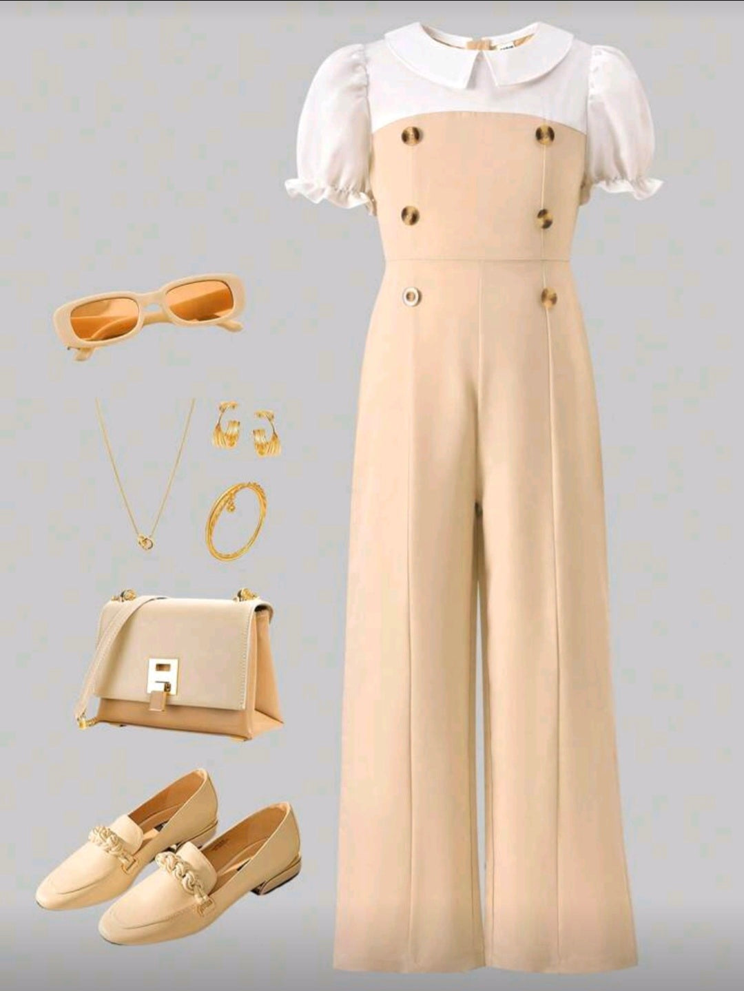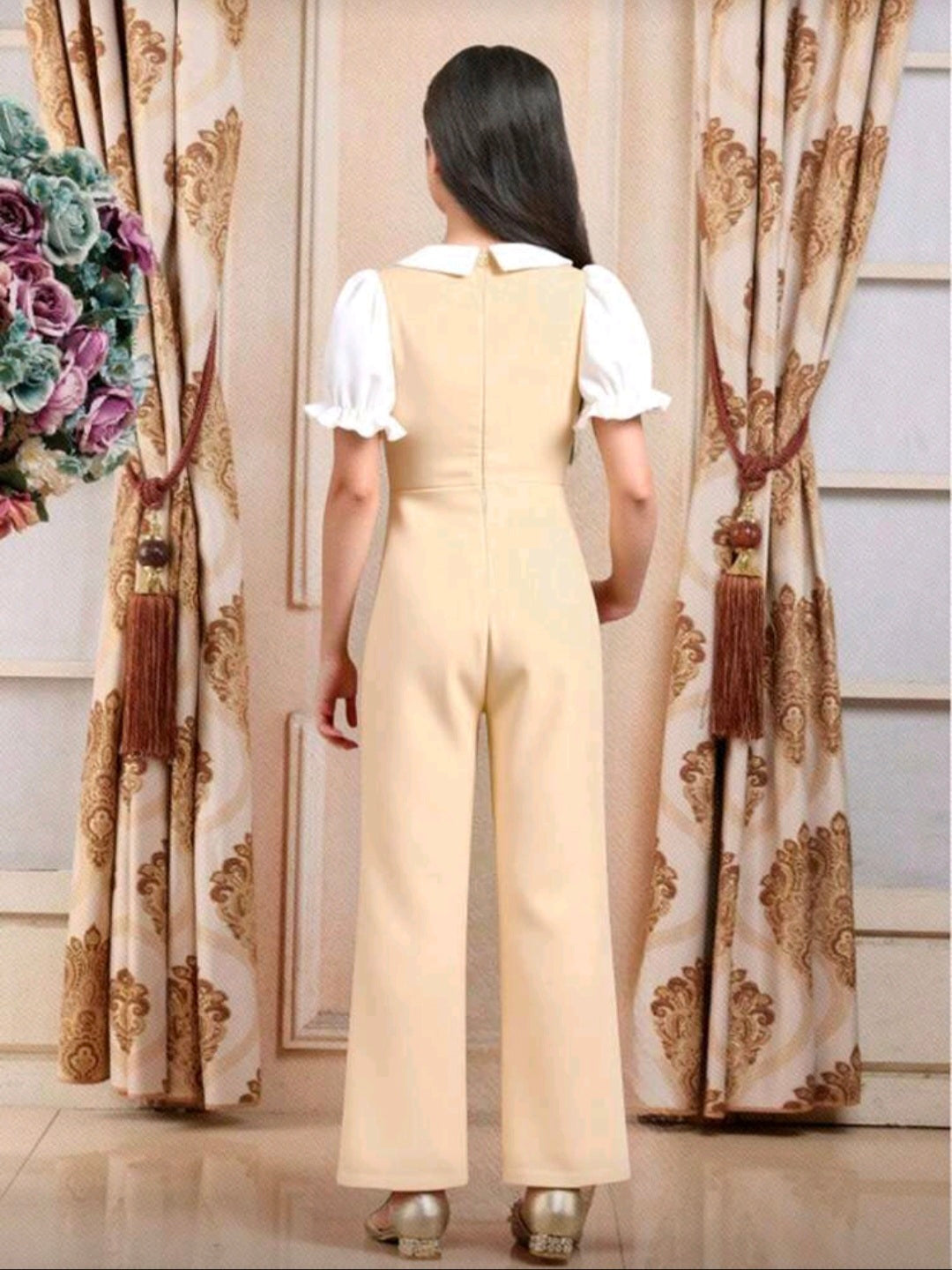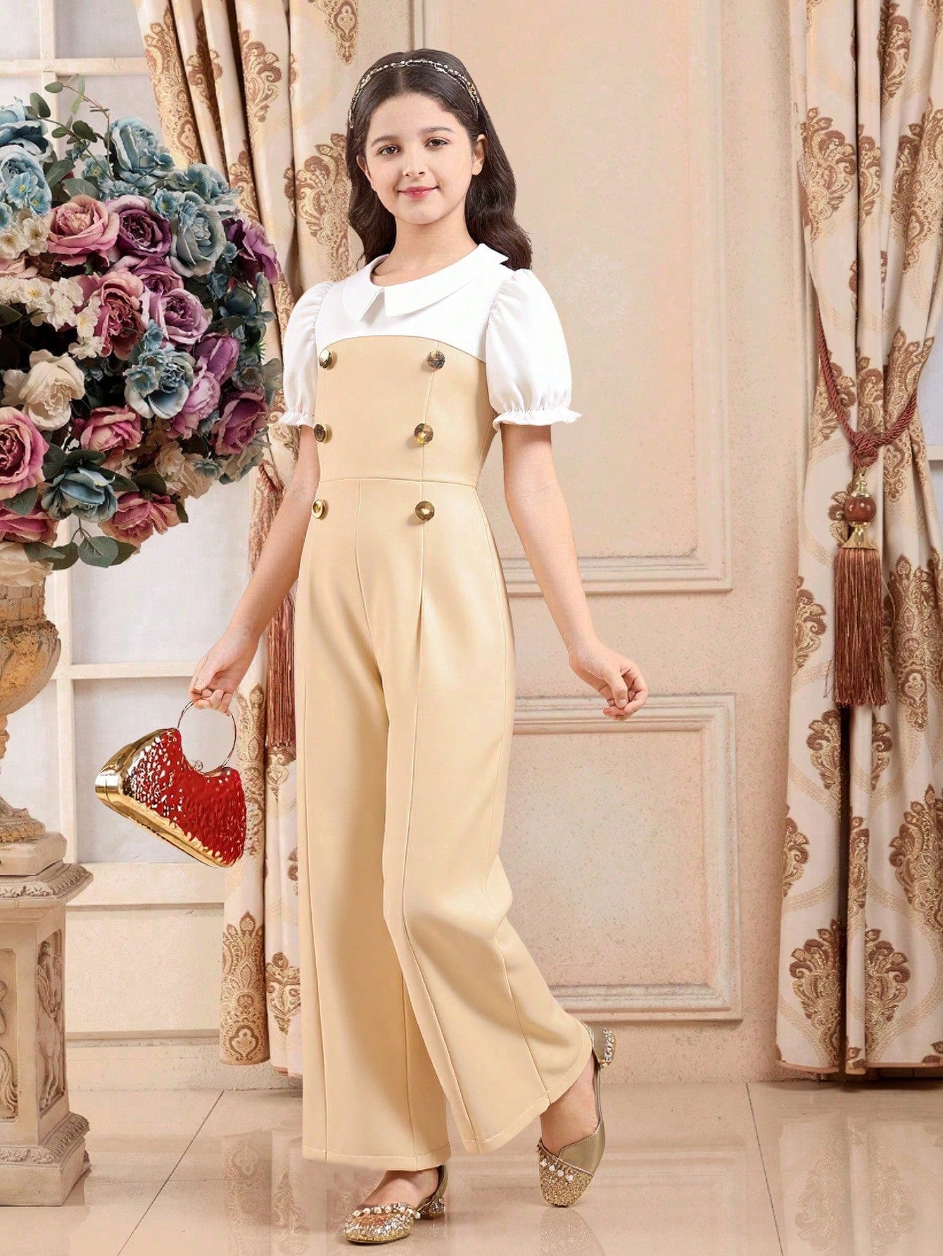 Mono elegante para niñas para ir y venir, monos tipo bustier de unicolor con cuello de muñeca y mangas abullonadas, estilo minimalista y práctico, adecuado para uso diario, escuela, eventos, primavera/verano