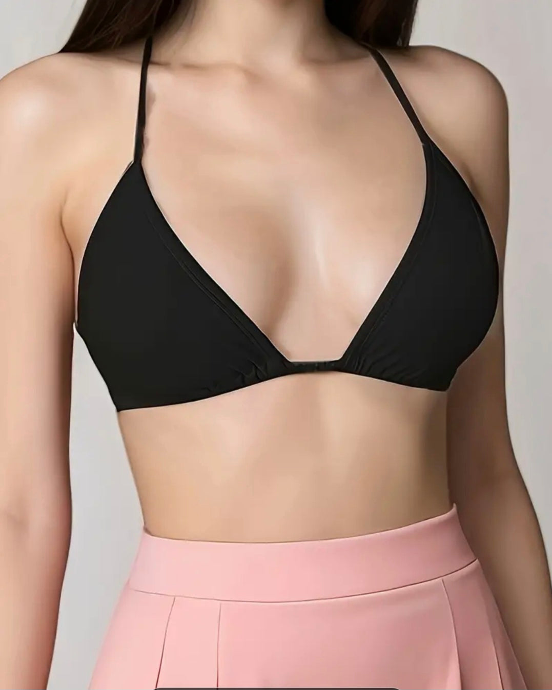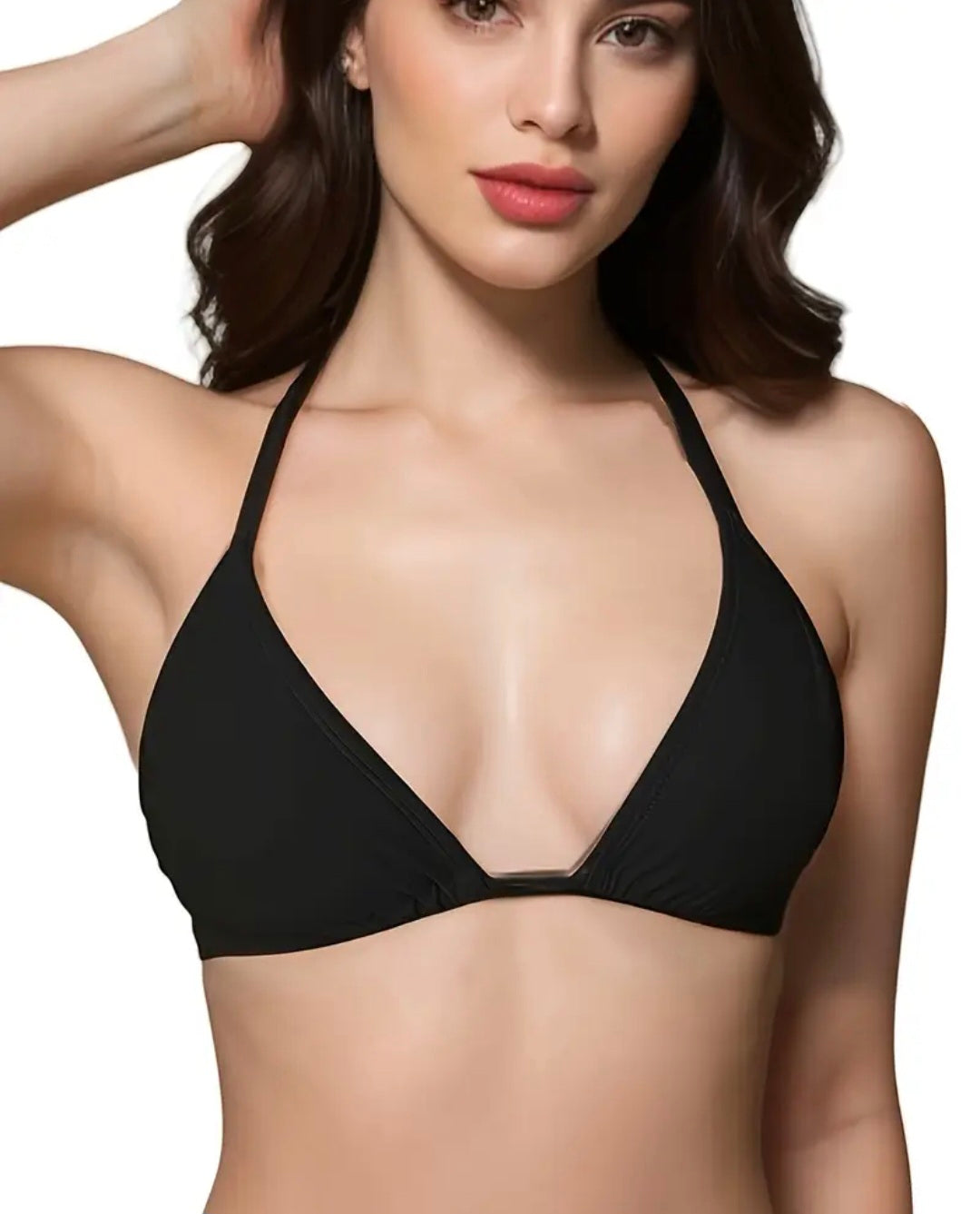 Top de bikini con cuello halter para mujer, clásico negro sólido, traje de baño ajustable con lazo en la espalda, ropa de playa de secado rápido, esencial para la piscina