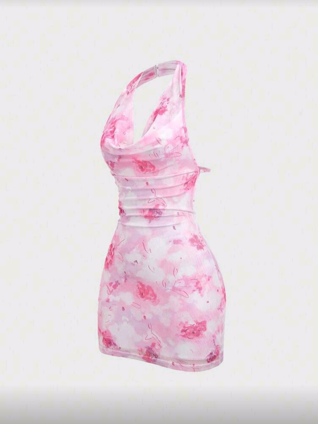 Sweetra Vestido mini con cuello fruncido con estampado floral elegante y lindo