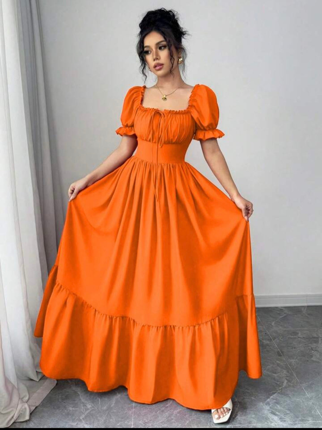 Rafferiza Vestido de cuello cuadrado con mangas abombadas, cierre delantero, espalda abierta y cintura ceñida para mujeres