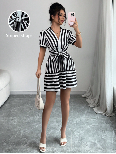 Elenzga Vestido casual con estampado de rayas, mangas cortas y cintura anudada para mujer