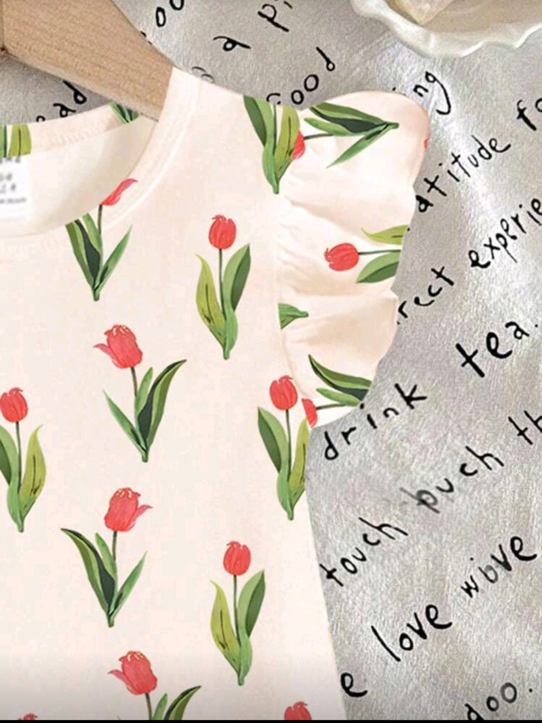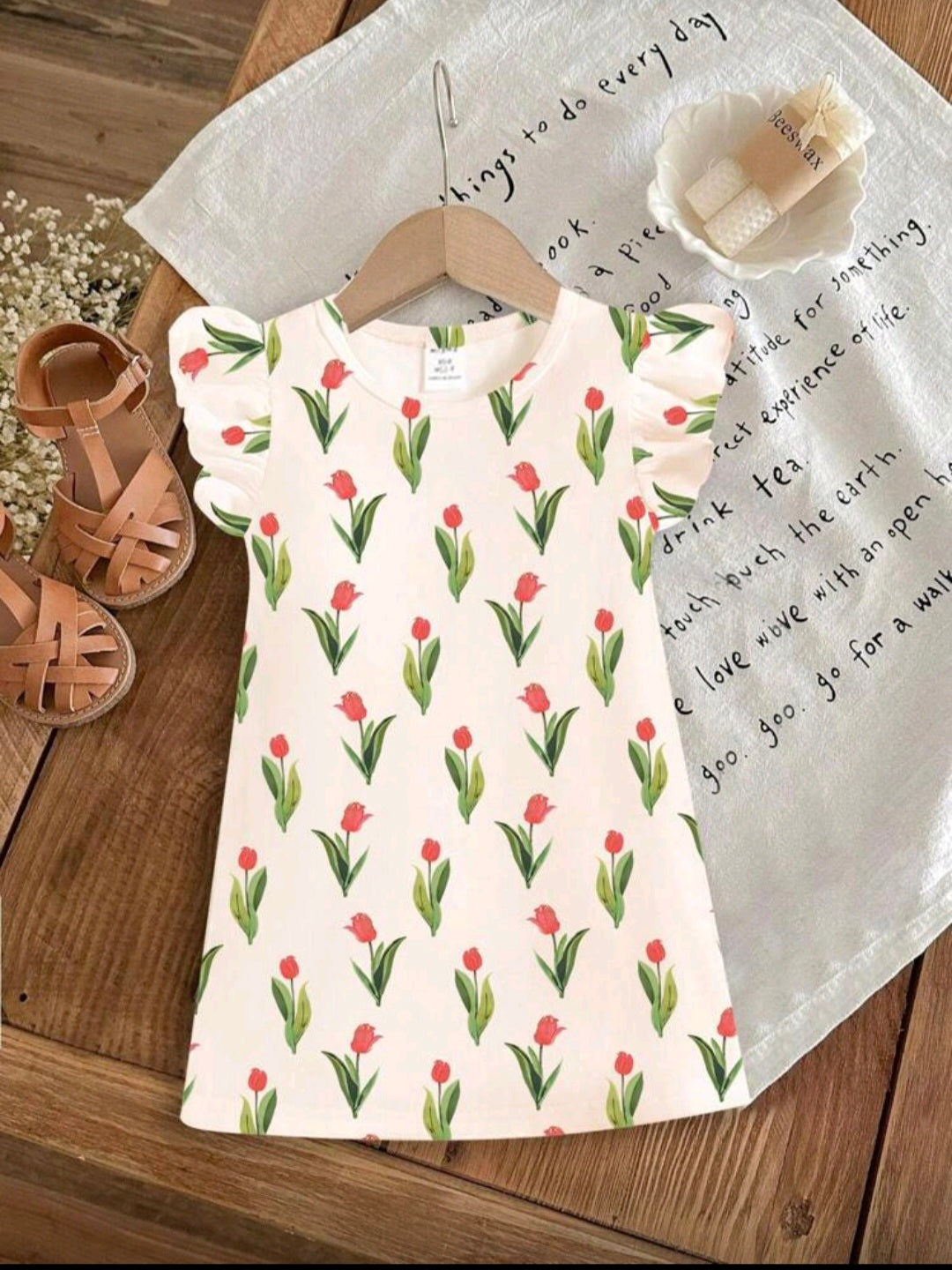 SHEIN Vestido de punto con cuello redondo y mangas cortas con estampado de tulipanes para niñas bebé