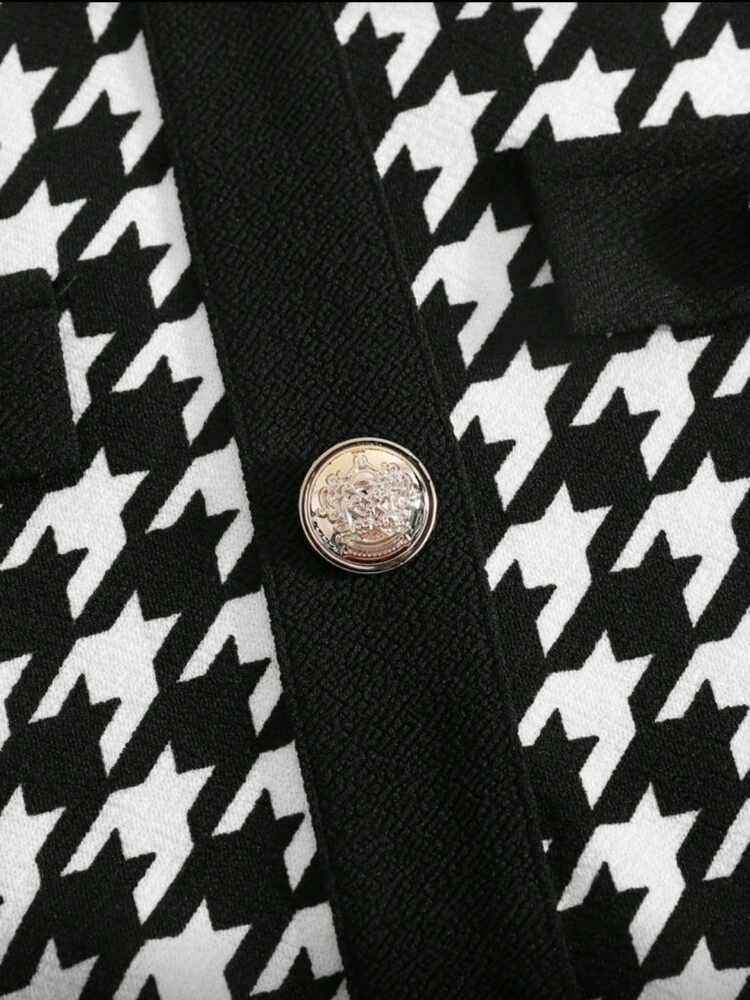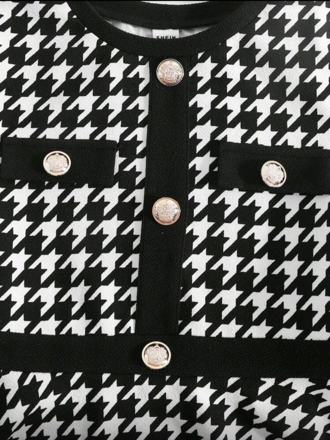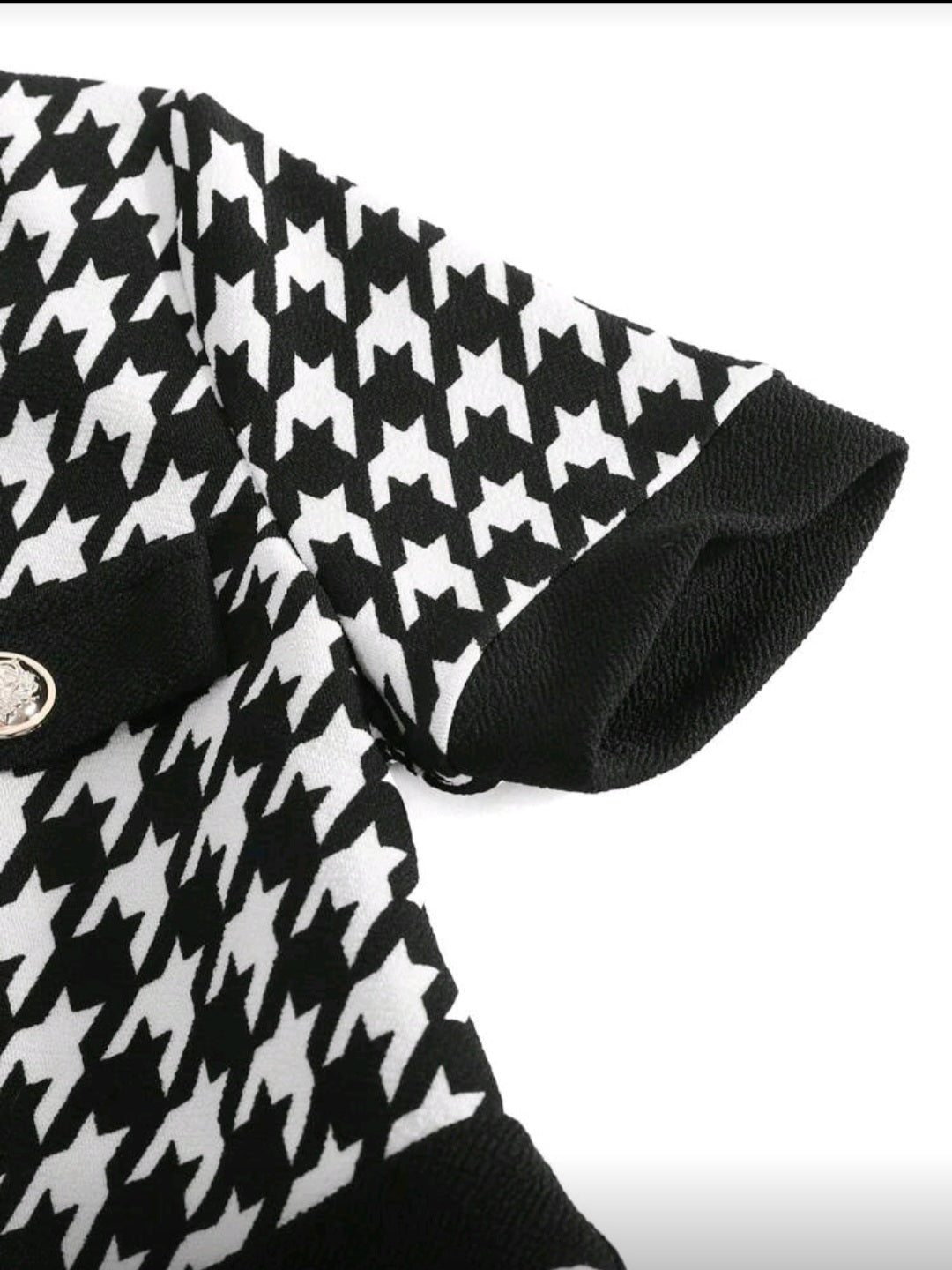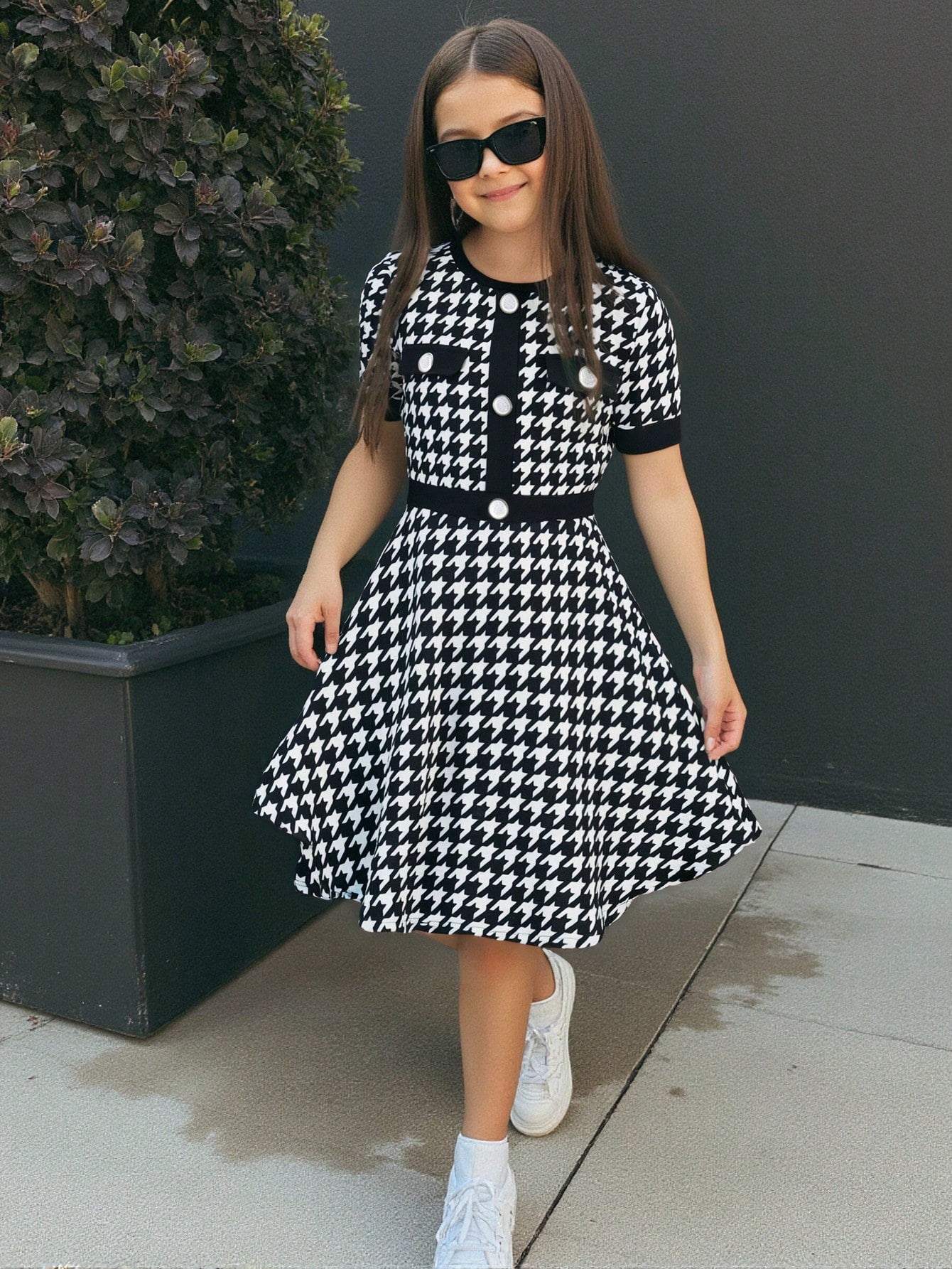 Firerie Kids Firerie Kids Vestido elegante de manga corta corte A para niñas preadolescentes con cuello camisero, decoración de botones, estampado de pata de gallo y parches, ideal para el regreso a la escuela, estilo informal urbano y femenino