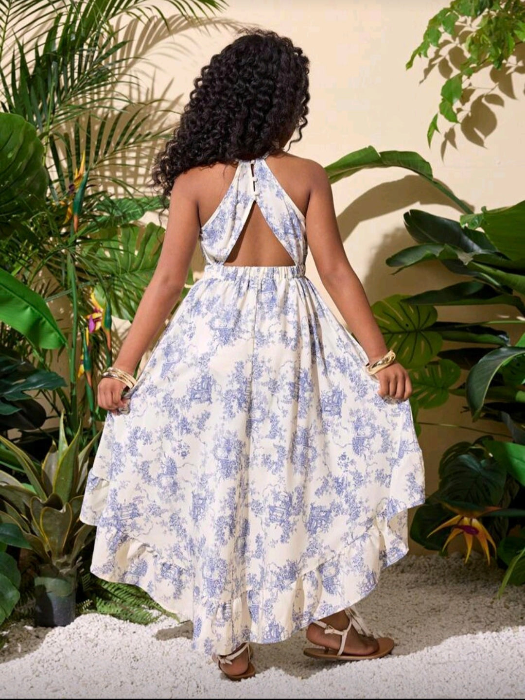 SHEIN Vestido sin mangas con estampado floral y cuello halter minimalista y elegante para niña preadolescente