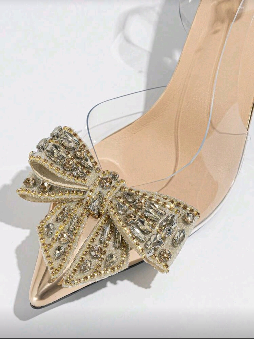 Tacones altos de PVC transparente con punta puntiaguda y detalle de lazo con strass para mujer, para baile de graduación, boda, fiesta, primavera y verano, color champán, zapatos para San Valentín, tacón de gatito